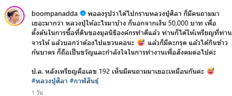 แถม บุ๋ม ปนัดดา ยังได้บอกเลขหลังเหรียญที่ได้มาด้วยว่าเป็นเลข 192 และโพสต์ข้อความว่า "พอลงรูปว่าได้ไปกราบหลวงปู่ศิลา ก็มีคนถามมาเยอะมากว่า หลวงปู่ให้อะไรมาบ้าง ก็นอกจากเงิน 50,000 บาท เพื่อตั้งต้นในการซื้อที่ดินของมูลนิธิองค์กรทำดีแล้ว ท่านก็ได้ให้เหรียญที่ท่านจารให้ แล้วบอกว่าต้องไปแขวนคอนะ แล้วก็มีตะกรุด แล้วได้กินข้าวก้นบาตร ก็ถือเป็นขวัญและกำลังใจในการทำงานเพื่อสังคมต่อไปค่ะ ป.ล. หลังเหรียญคือเลข 192 เห็นมีคนถามมาเยอะเหมือนกันค่ะ หลวงปู่ศิลา กาฬสินธุ์
