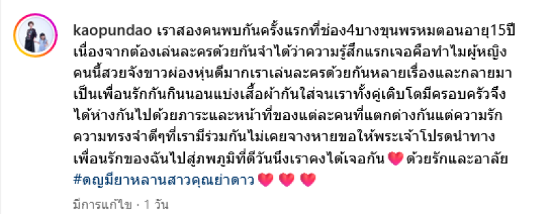 โดยเขียนข้อความว่า "เราสองคน พบกันครั้งแรกที่ช่อง 4 บางขุนพรหม ตอนอายุ 15 ปี เนื่องจากต้องเล่นละครด้วยกัน จำได้ว่าความรู้สึกแรกเจอคือ ทำไมผู้หญิงคนนี้สวยจัง ขาว ผ่อง หุ่นดีมาก เราเล่นละครด้วยกันหลายเรื่อง และกลายมาเป็นเพื่อนรักกัน กินนอน แบ่งเสื้อผ้ากันใส่ จนเราทั้งคู่เติบโตมีครอบครัว จึงได้ห่างกันไปด้วยภาระ และหน้าที่ของแต่ละคนที่แตกต่างกัน