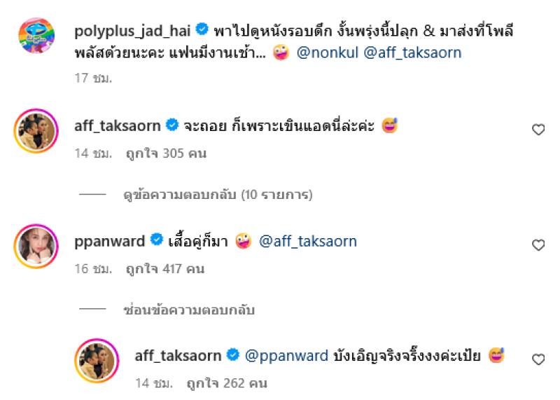 ล่าสุด แอฟ ทักษอร ได้ควงแขน นนกุล ไปดูภาพยนตร์รอบดึก พร้อมกับลูกสาวสุดที่รัก น้องปีใหม่ พร้อมถ่ายภาพร่วมเฟรมกัน 3 คน อย่างอบอุ่นสุดๆ และมีอินสตาแกรม polyplus_jad_hai ได้ลงรูปภาพดังกล่าว อีกทั้งยังเขียนแคปชั่นแซว "พาไปดูหนังรอบดึก งั้นพรุ่งนี้ปลุก มาส่งที่โพลีพลัสด้วยนะคะ แฟนมีงานเช้า... nonkul aff_taksaorn" ทำเอา แอฟ ทักษอร รีบเข้ามาตอบกลับแบบเขินๆ ทันทีว่า "จะถอย ก็เพราะเขินแอดนี่ล่ะค่ะ" และทางด้าย เป้ย ก็ได้เข้ามาคอมเมนต์แซวว่า เสื้อคู่ก็มา