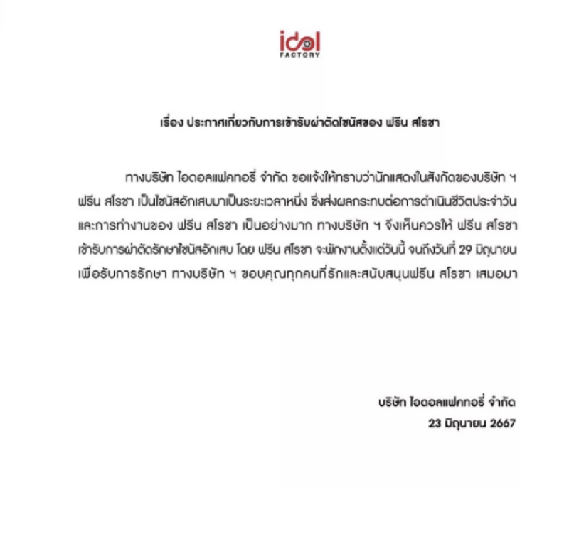 ทางบริษัทฯ จึงเห็นควรให้ ฟรีน สโรชา เข้ารับการผ่าตัดรักษาไซนัสอักเสบ โดย ฟรีน สโรชา จะพักงานตั้งแต่วันนี้ จนถึงวันที่ 29 มิถุนายน เพื่อรับการรักษา ทางบริษัทฯ ขอขอบคุณทุกคนที่รักและสนับสนุน ฟรีน สโรชา เสมอมา