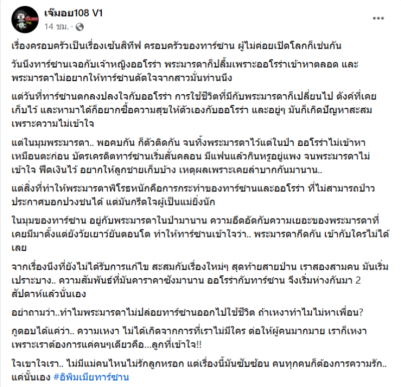 จากกระแสข่าวที่กำลังมาแรง เมื่อเพจดัง อย่าง เจ๊มอย108 V1 ได้ออกมาเล่านิทานถึงเรื่องความรักและเรื่องครอบครัวเป็นเรื่องเซ้นสิทีฟ โดยได้เล่าว่า เรื่องครอบครัวเป็นเรื่องเซ้นสิทีฟ ครอบครัวของทาร์ซาน ผู้ไม่ค่อยเปิดโลกก็เช่นกัน