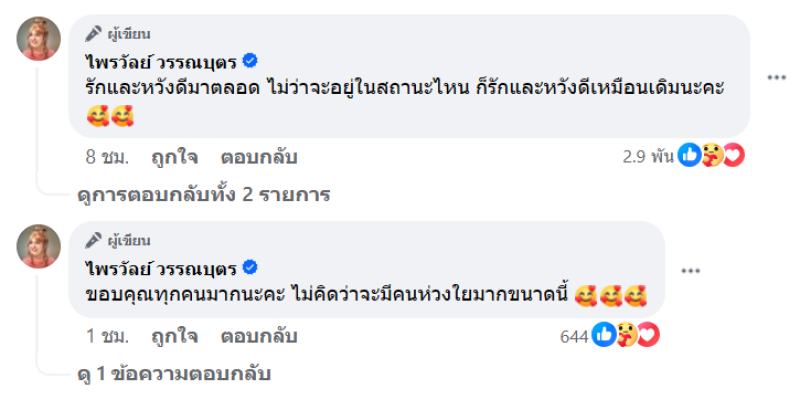 เรียกได้ว่า ช่วงนี้ข่าวเลิกกันในวงการนั้นกำลังมาแรง ล่าสุดทาง ไพรวัลย์ วรรณบุตร ได้โพสต์เศร้าว่า ถึงจะเศร้าแค่ไหนก็ต้องไปเอารองเท้าคืน (ลืมพวงกุญแจด้วย) คุยกันค่ะ ต้องคุยกัน จะรักกันหรือจากกัน ก็ต้องไปอย่างมีความรู้สึกดีๆ ให้กัน ไม่เสียหายเลย กอดกันสักครั้งก่อนแยกย้ายก็ได้