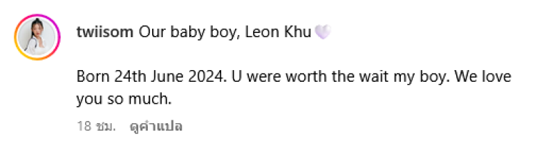 Born 24th June 2024. U were worth the wait my boy. We love you so much." ท่ามกลางชาวเน็ตที่เข้ามาแสดงยินดีมากมาย