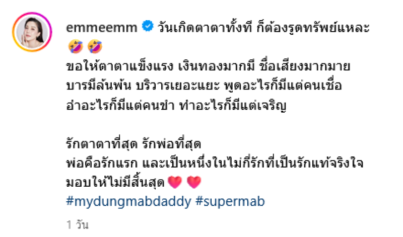 พร้อมเขียนคำอวยพรวันเกิดให้คุณพ่อว่า วันเกิดตาตาทั้งที ก็ต้องรูดทรัพย์แหละ ขอให้ตาตาแข็งแรง เงินทองมากมี ชื่อเสียงมากมาย บารมีล้นพ้น บริวารเยอะแยะ พูดอะไรก็มีแต่คนเชื่อ อำอะไรก็มีแต่คนขำ ทำอะไรก็มีแต่เจริญ "รักตาตาที่สุด รักพ่อที่สุด พ่อคือรักแรก และเป็นหนึ่งในไม่กี่รักที่เป็นรักแท้จริงใจมอบให้ไม่มีสิ้นสุด mydungmabdaddy supermab" ท่วมกลางชาวเน็ตคอมเมนต์อวยพรกันอย่างมากมาย