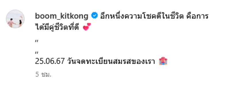 เป็นอีกหนึ่งคู่ที่ได้เข้าประตูวิวาห์กันไปแบบเรียบง่าย เมื่อวันที่ 11 กันยายน 2566 ที่ผ่านมา หลังจากที่ฝ่ายชายได้ให้ผู้ใหญ่ไปทำพิธีสู่ขอแฟนสาว เมื่อต้นเดือนมีนาคม 2566 อย่างคู่ของ พระเอกหนุ่มสุดหล่อ บูม กิตตน์ก้อง และสาวสวยสุดเซ็กซี่ กีฟ ดราภดา