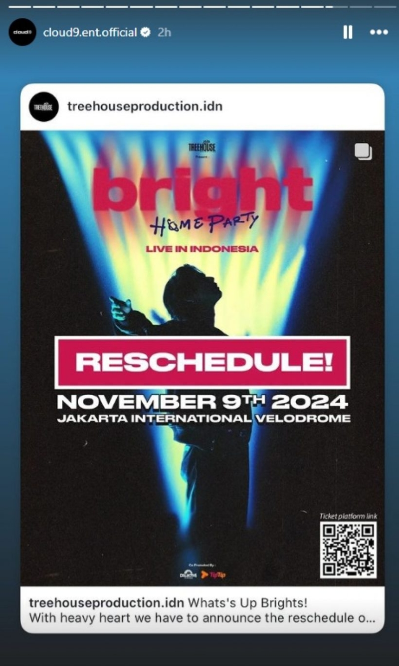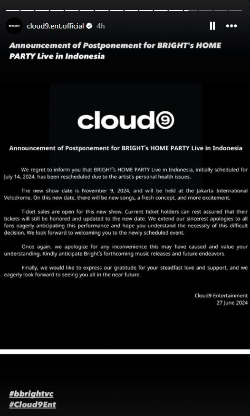 แต่ทางด้านค่าย Cloud9 Entertainment ก็ได้ออกมาประกาศข่าวกะทันหันว่า แจ้งเลื่อนวันจัดปาร์ตี้คอนเสิร์ตประเทศอินโดนีเซีย เนื่องจาก ไบร์ท มีปัญหาด้านสุขภาพ ทำให้ต้องเลื่อนไปเป็นวันที่ 9 พฤศจิกายนแทน และเปลี่ยนสถานที่เป็น jakarta international velodrome แฟนๆเอเชียต่างส่งกำลังใจให้อย่างมาก