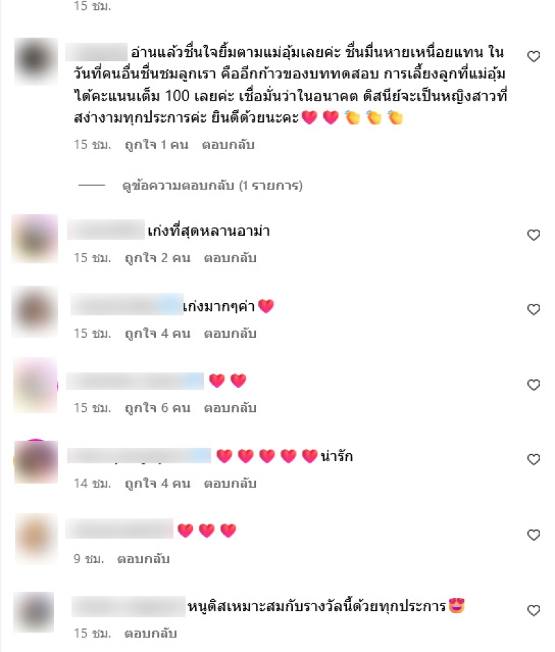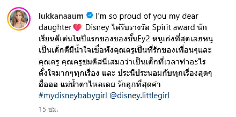 แต่ล่าสุด อุ้ม ถึงกับน้ำตาไหลเมื่อน้องดิสนีย์ได้รับรางวัล Spirit award นักเรียนดีเด่นในปีแรกของของชั้นEy2 และได้โพสต์ในอินสตาแกรมส่วนตัวว่า "I'm so proud of you my dear daughter Disney ได้รับรางวัล Spirit award นักเรียนดีเด่นในปีแรกของของชั้นEy2 หนูเก่งที่สุดเลยหนูเป็นเด็กดีมีน้ำใจเชื่อฟังคุณครูเป็นที่รักของเพื่อนๆและคุณครู คุณครูชมดิสนีเสมอว่าเป็นเด็กที่เวลาทำอะไรตั้งใจมากๆทุกเรื่อง และ ประนีประนอมกับทุกเรื่องสุดๆ ฮือออ แม่น้ำตาไหลเลย รักลูกที่สุดค่า mydisneybabygirl disney.littlegirl" ทำเอาแฟนๆคอมเมนต์ร่วมยินดีและชื่นชมกับ น้องดิสนีย์ เป็นจำนวนมาก