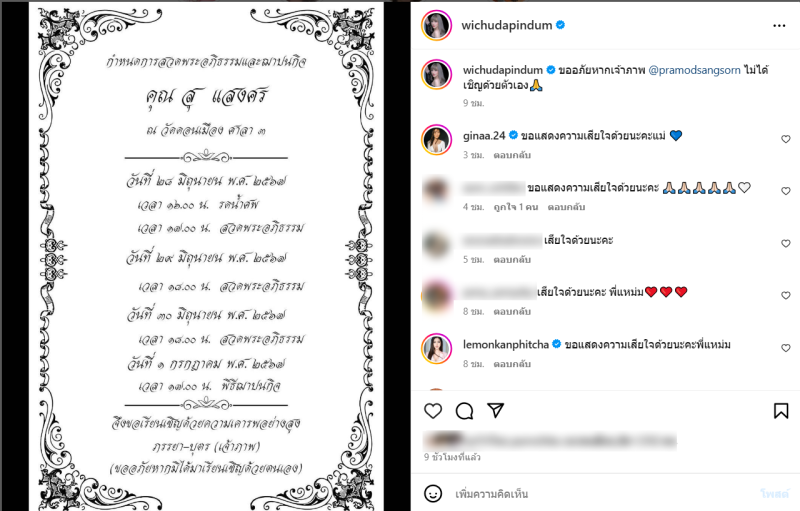 เรียกได้ว่า เป็นข่าวเศร้า เมื่อล่าสุดทาง แหม่ม วิชุดา ได้ออกมาเผยการสูญเสียของครอบครัว ปราโมทย์ แสงศร ที่ได้สูญเสียคุณพ่อไปตลอดกาล โดยได้โพสต์ผ่านทางอินสตาแกรม แหม่ม วิชุดา พร้อมระบุข้อความว่า ขออภัยหากเจ้าภาพ @pramodsangsorn ไม่ได้เชิญด้วยตัวเอง ซึ่งเป็นกำหนดพิธีต่างๆนั่นเอง
