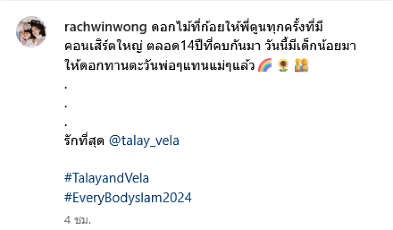 ล่าสุด ก้อย โพสต์อินสตราแกรมส่วนตัว เผยโมเมนต์ครอบครัวอบอุ่น พร้อมหอบช่อดอกไม้ไปให้สามี ถึงหลังเวที ที่ทำมาตลอด 14 ปี พร้อมเขียนข้อความว่า "ดอกไม้ที่ก้อยให้พี่ตูนทุกครั้งที่มีคอนเสิร์ตใหญ่ ตลอด14ปีที่คบกันมา วันนี้มีเด็กน้อยมาให้ดอกทานตะวันพ่อๆแทนแม่ๆแล้ว รักที่สุด talay_vela TalayandVela EveryBodyslam2024"
