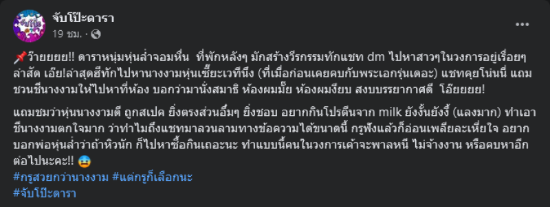 "ว๊ายยยย ดาราหนุ่มหุ่นล่ำจอมหื่น ที่พักหลังๆ มักสร้างวีรกรรมทักแชท dm ไปหาสาวๆในวงการอยู่เรื่อยๆ ล่าสัตว์ เอ๊ย!ล่าสุด ฮีทักไปหานางงามหุ่นเซี๊ยะเวทีนึง (ที่เมื่อก่อนเคยคบกับพระเอกรุ่นเดอะ) แชทคุยโน่นนี่ แถมชวนชีนางงามให้ไปหาที่ห้อง บอกว่ามานั่งสมาธิ ห้องผมมั๊ย ห้องผมงียบ สงบบรรยากาศดี โอ๊ยยยย