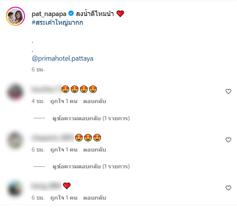 เป็นอีกหนึ่งเจ้าแม่สายแฟนชั่นเช่นกัน แต่ละลุคไม่เคยซ้ำกัน อย่าง แพท ณปภา เป็นคุณแม่สายแซ่บและเข้มแข็งสุดๆ ผ่านดรื่องราวมามากมาย และตัวแบบในความกตัญญูกับคุณแม่มาตลอด ล่าสุด คุณแม่ลูกหนึ่งอย่าง แพท ออกมาอัปเดตความแซ่บอีกครั้ง ผ่านอินสตาแกรม พร้อมระบุข้อความสั้นๆว่า ลงน้ำดีไหมน้า #สระเค้าใหญ่มากก