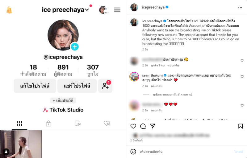 ล่าสุด ได้ออกมาโพสต์ผ่านอินสตาแกรมอีกครั้งว่า ใครอยากเห็นไอซ์ LIVE TikTok ต่อไปติดตามให้ถึง 1000 นะคะแล้วถึงจะไลฟ์สดได้ค่ะ Account เก่าบินค่ะเข้มงวดเกินนนนน Anybody want to see me broadcasting live on TikTok please follow my new account. The second account that I made for you guys, but the thing is It has to be 1000 followers so I could go on broadcasting live