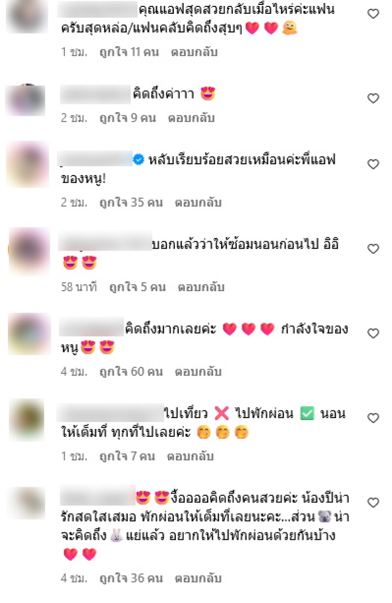 หลังจากที่เเฟนๆได้เห็นของ แอฟ ล่าสุดต่างเข้ามาคอมเมนต์แซวเพียบ อาทิ หลับเรียบร้อยสวยเหมือนค่ะพี่แอฟของหนู,555 บอกแล้วว่าให้ซ้อมนอนก่อนไป อิอิ,พร้อมนอนเสมอ หมอนซักใบไหมคะ,ตื่นมาเที่ยวด้วยนะค้าาา เป็นต้น