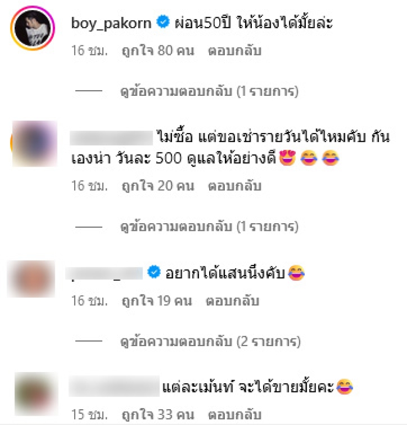 งานนี้ทำเอาชาวเน็ตและเหล่าวงการบันเทิงเข้ามาคอมเมนต์มากมาย อาทิ วิ่งน้อยมากเลยครับ ปกติเข็นเอาเหรอครับ,ไม่ซื้อ แต่ขอเช่ารายวันได้ไหมคับ กันเองน่า วันละ 500 ดูแลให้อย่างดี,แต่ละเม้นท์ จะได้ขายมั้ยคะ เป็นต้น