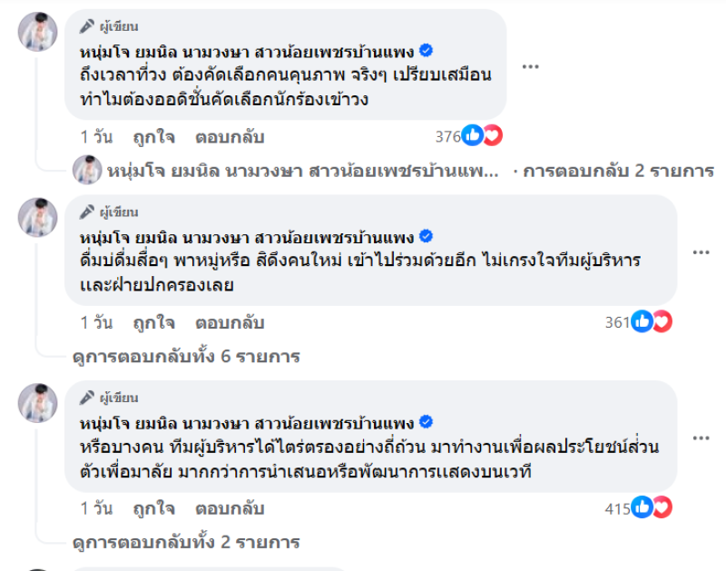 และยังคอมเมนต์ใต้โพสต์เพิ่มว่า ถึงเวลาที่วง ต้องคัดเลือกคนคุนภาพ จริงๆ เปรียบเสมือน ทำไมต้องออดิชั่นคัดเลือกนักร้องเข้าวง