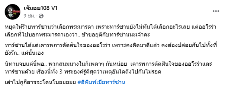 เมื่อวันที่ 4 ก.ค. 67 ที่ผ่านมา ทางเพจดัง อย่างเจ๊มอย108 V1 ได้ออกมาเล่านิทานตอนจบ โดยได้โพสต์ว่า หยุดให้ร้ายทาร์ซานว่าเลือกพระมารดา เพราะทาร์ซานยังไม่ทันได้เลือกอะไรเลย แต่ออโรร่าเลือกที่ไปบอกพระมารดาเองว่า.. ข้าขอยุติกับทาร์ซานนะเจ้าคะ