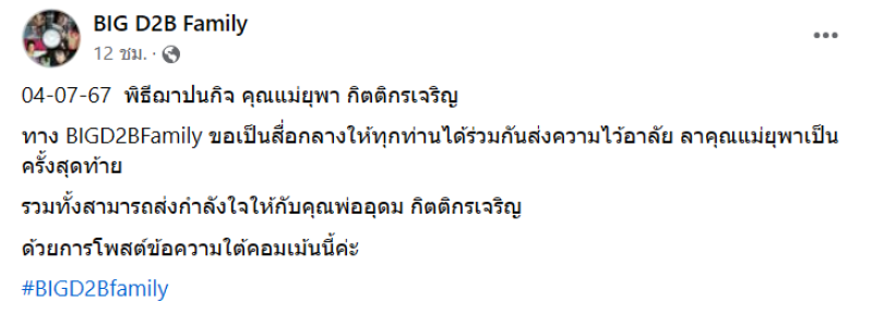 ล่าสุด ทางเพจ BIG D2B Family ได้เผยภาพบรรยากาศส่งคุณแม่เป็นครั้งสุดภาพ โดยได้เผยว่า 04-07-67 พิธีฌาปนกิจ คุณแม่ยุพา กิตติกรเจริญ ทาง BIGD2BFamily ขอเป็นสื่อกลางให้ทุกท่านได้ร่วมกันส่งความไว้อาลัย ลาคุณแม่ยุพาเป็นครั้งสุดท้าย รวมทั้งสามารถส่งกำลังใจให้กับคุณพ่ออุดม กิตติกรเจริญ ด้วยการโพสต์ข้อความใต้คอมเม้นนี้ค่ะ #BIGD2Bfamily