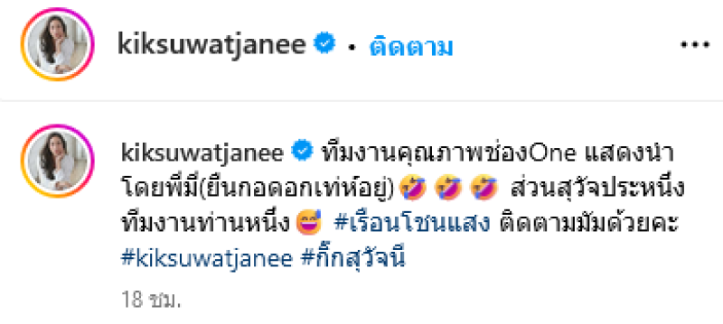 ซึ่งทางด้าน กิ๊ก ได้ออกมาโพสต์ภาพในอินสตาแกรมส่วนตัว พร้อมเผยข้อความว่า ทีมงานคุณภาพช่องOne แสดงนำโดยพี่มี่(ยืนกอดอกเท่ห์อยู่) ส่วนสุวัจประหนึ่งทีมงานท่านหนึ่ง เรือนโชนแสง ติดตามมัมด้วยคะ kiksuwatjanee กิ๊กสุวัจนี เรียกได้ว่าแฟนๆต่างเข้ามาคอมเมนต์ดีใจกันอย่างมาก