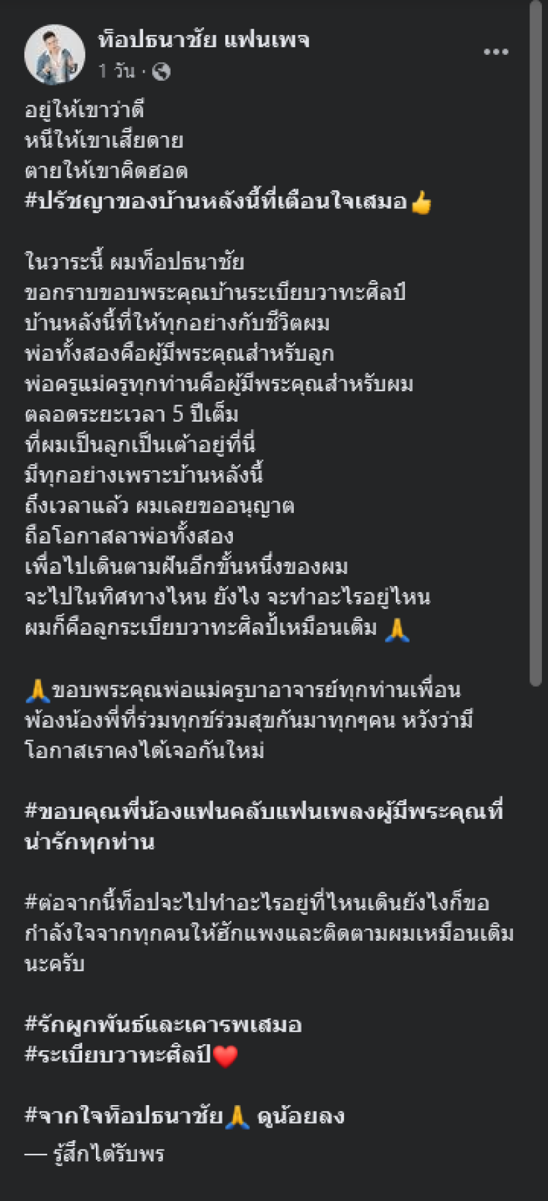 พร้อมเขียนข้อความอำลา หลังสร้างผลงานมานานถึง 5ปี อยู่ให้เขาว่าดี หนีให้เขาเสียดาย ตายให้เขาคิดฮอด ปรัชญาของบ้านหลังนี้ที่เตือนใจเสมอ ในวาระนี้ ผมท็อปธนาชัย ขอกราบขอบพระคุณบ้านระเบียบวาทะศิลป์ บ้านหลังนี้ที่ให้ทุกอย่างกับชีวิตผม พ่อทั้งสองคือผู้มีพระคุณสำหรับลูก พ่อครูแม่ครูทุกท่านคือผู้มีพระคุณสำหรับผม ตลอดระยะเวลา 5 ปีเต็ม ที่ผมเป็นลูกเป็นเต้าอยู่ที่นี่ มีทุกอย่างเพราะบ้านหลังนี้ ถึงเวลาแล้ว ผมเลยขออนุญาต