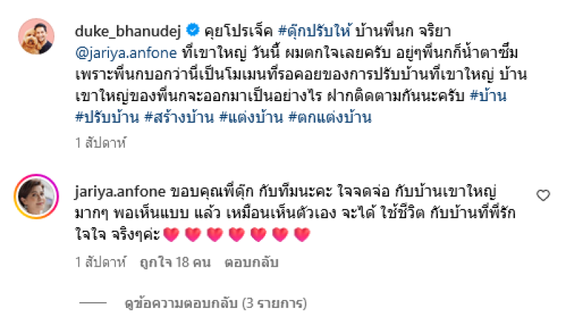 โดย ดุ๊ก ได้คลิปขณะที่นั่งพูดคุยถึงรายละเอียดในอินสตาแกรมส่วนตัว ซึ่งขณะที่พูดคุยอยู่นั้น นก จริยา ก็ถึงกับน้ำตาซึมเพราะความรู้สึกปลื้มปริ่ม เนื่องจากเป็นความตั้งใจที่อยากจะทำให้เกิดขึ้นมานานแล้ว พร้อมข้อความว่า คุยโปรเจ็ค ดุ๊กปรับให้ บ้านพี่นก จริยา jariya.anfone ที่เขาใหญ่ วันนี้ ผมตกใจเลยครับ อยู่ๆพี่นกก็น้ำตาซึม เพราะพี่นกบอกว่านี่เป็นโมเมนที่รอคอยของการปรับบ้านที่เขาใหญ่ บ้านเขาใหญ่ของพี่นกจะออกมาเป็นอย่างไร ฝากติดตามกันนะครับ บ้าน ปรับบ้าน สร้างบ้าน แต่งบ้าน ตกแต่งบ้าน