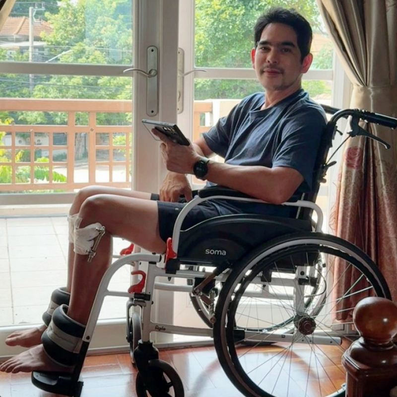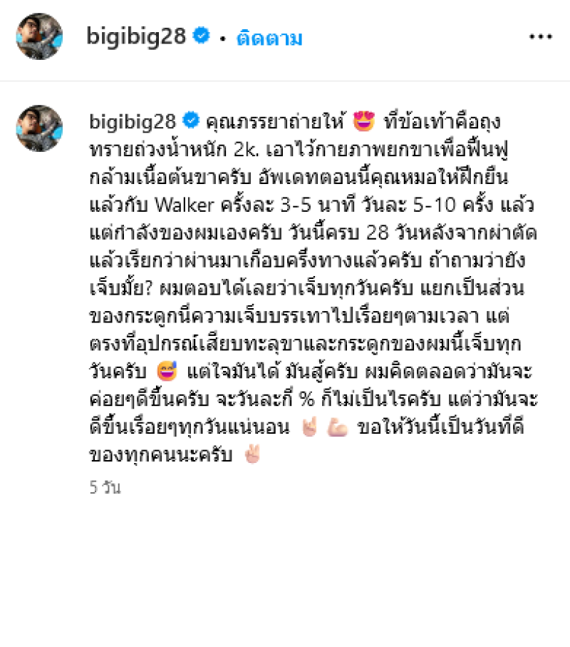 พร้อมแคปชั่นว่า คุณภรรยาถ่ายให้ ที่ข้อเท้าคือถุงทรายถ่วงน้ำหนัก 2k. เอาไว้กายภาพยกขาเพื่อฟื้นฟูกล้ามเนื้อต้นขาครับ อัพเดทตอนนี้คุณหมอให้ฝึกยืนแล้วกับ Walker ครั้งละ 3-5 นาที วันละ 5-10 ครั้ง แล้วแต่กำลังของผมเองครับ วันนี้ครบ 28 วันหลังจากผ่าตัดแล้วเรียกว่าผ่านมาเกือบครึ่งทางแล้วครับ ถ้าถามว่ายังเจ็บมั้ย