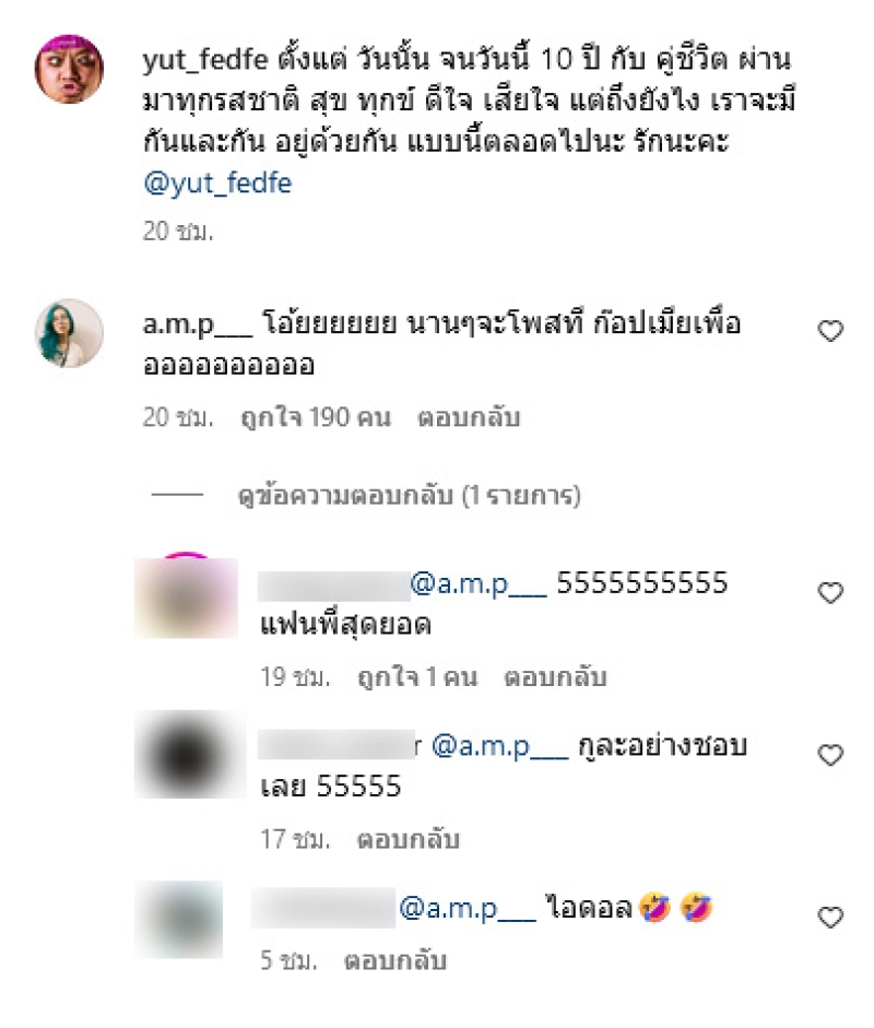 อีกหนึ่งคู่รักชื่อดังที่ใช้ชีวิตคู่ด้วยกันนานถึง 10ปี สำหรับ ยัต เฟ็ดเฟ่ หลังจากที่ไม่ค่อยได้ลงรูปคู่หวานๆกับภรรยากันสักเท่าไหร่ เเต่เมื่อล่าสุด ได้โพสต์ภาพพร้อมแคปชั่นว่า ตั้งแต่ วันนั้น จนวันนี้ 10 ปี กับ คู่ชีวิต ผ่านมาทุกรสชาติ สุข ทุกข์ ดีใจ เสียใจ แต่ถึงยังไง เราจะมีกันและกัน อยู่ด้วยกัน แบบนี้ตลอดไปนะ รักนะคะ yut_fedfe