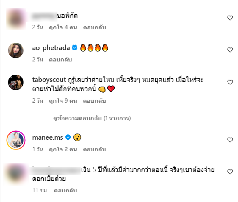 งานนี้ คนในวงการมากมาย และหนึ่งในนั้นก็คือ ต๊ะ บอยสเก๊าท์ หรือ ต๊ะ วินรวีร์ กับข้อความที่ระบุว่า กูรู้เลยว่าค่ายใหน เหี้ยจริงๆ หมดยุคแล้ว เมื่อไหร่จะตายห่าไปสักทีคนพวกนี้ และด้านชาวเน็ตเองก็เข้ามาแสดงความคิดเห็นกันจำนวนมาก