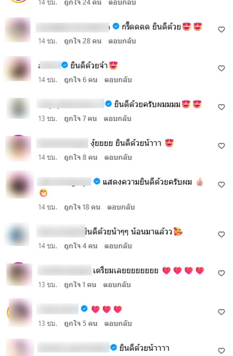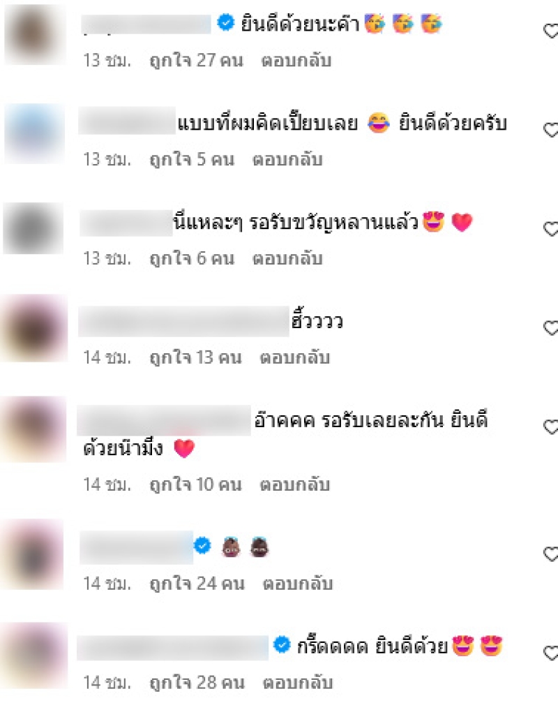 งานนี้ทำเอาแฟนๆและเพื่อนในวงการได้เห็นโพสต์ถึงกับกรี๊ดเเละคอมเมนต์แสดงความยินดีกันอย่างมากเลยทีเดียว อาทิ นี่แหละๆ รอรับขวัญหลานแล้ว,ยินดีด้วยจ้า,กรี๊ดดดด ยินดีด้วย,ยินดีด้วยน้าๆๆ น้อนมาแล้วว,ยินดีด้วยนะค่ะข้าวตูน้องน้ำผึ้งจะมี ตูน้อยหรือผึ้งน้อย เป็นต้น