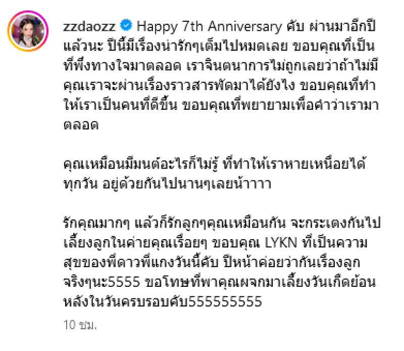 เรียกได้ว่าเป็นคู่รักนักร้องที่รักยาวนานถึง 7ปี สำหรับ ดาว โอเกะ และ แกงส้ม เดอะสตาร์ ต้องบอกเลยว่าทั้งคู่มักจะอวดโมเมนต์หวานๆลงในอินสตาแกรมส่วนตัวให้แฟนๆได้เห็นกันอยู่บ่อยๆ ล่าสุด ดาว ได้โพสต์โมเมนต์น่ารักกับข้อความสุดซึ้ง พร้อมเขียนแคปชั่นว่า Happy 7th Anniversary คับ ผ่านมาอีกปีแล้วนะ ปีนี้มีเรื่องน่ารักๆเต็มไปหมดเลย ขอบคุณที่เป็นที่พึ่งทางใจมาตลอด