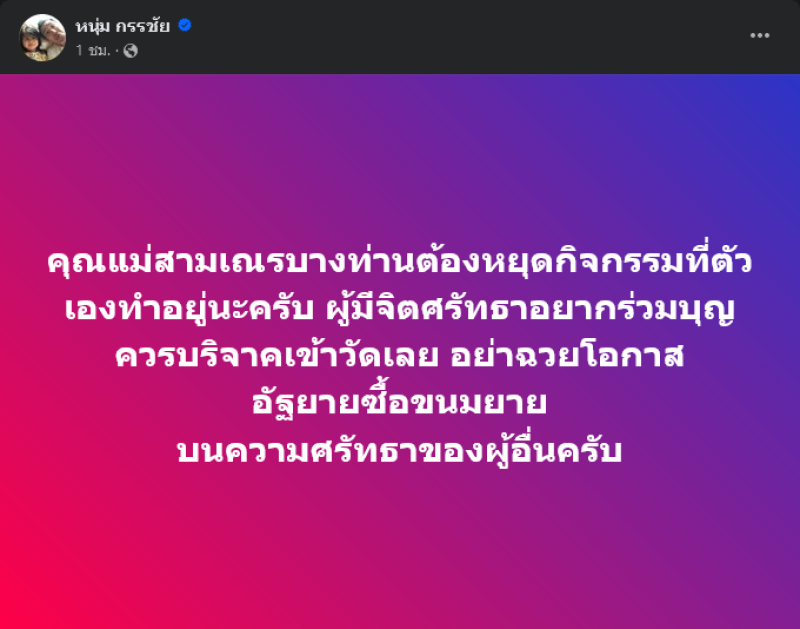 เรียกได้ว่าเดือดสุดๆเลยทีเดียว สำหรับพิธีกรมากความสามารถอย่าง หนุ่ม กรรชัย ที่ล่าสุดได้ออกมาโพสต์เฟซบุ๊คส่วนตัวเตือนแม่ของสามเณรคนหนึ่งพร้อมเขียนข้อความว่า คุณแม่สามเณรบางท่านต้องหยุดกิจกรรมที่ตัวเองทำอยู่นะครับ ผู้มีจิตศรัทธาอยากร่วมบุญควรบริจาคเข้าวัดเลย อย่าฉวยโอกาส อัฐยายซื้อขนมยาย บนความศรัทธาของผู้อื่นครับ