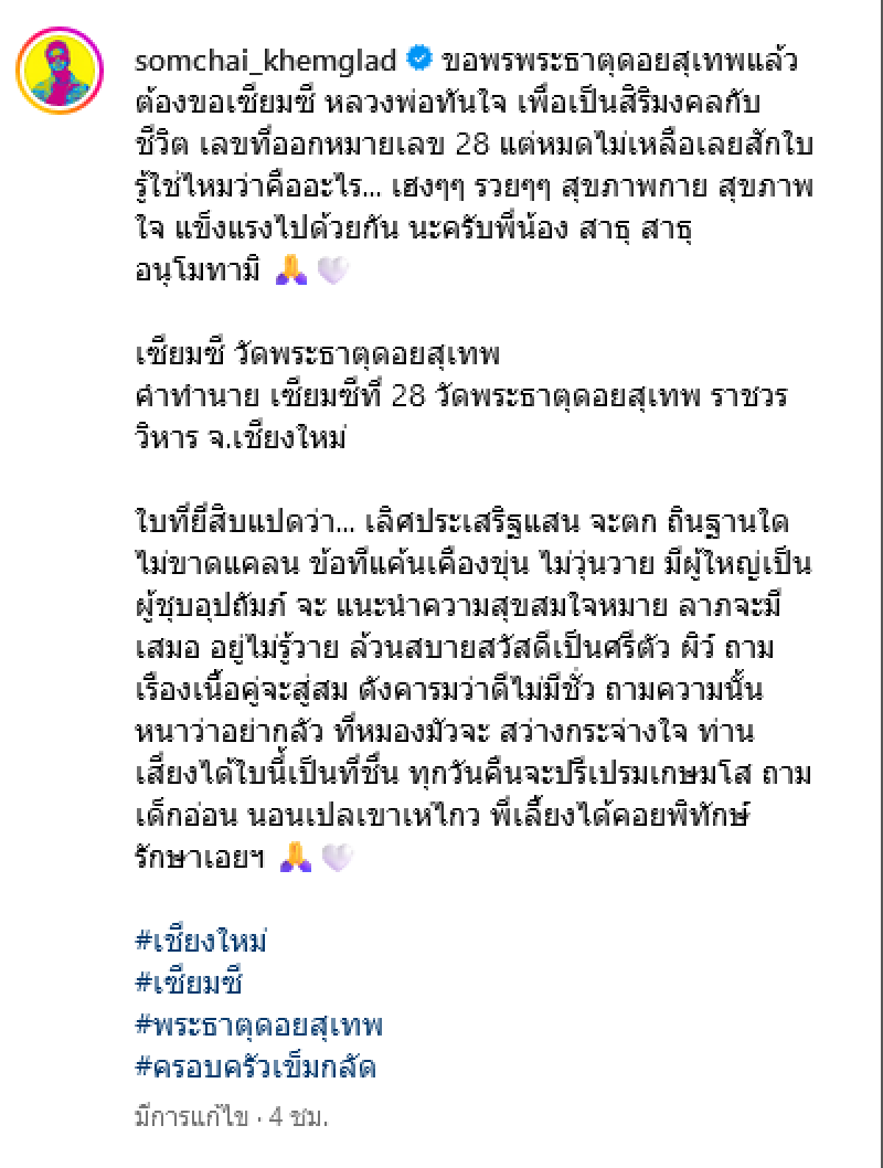 ทั้งนี้ เต๋า ยังได้โพสต์ภาพเลขเซียมซีที่เสี่ยงออกมาไได้นั้น พร้อมกับเขียนแคปชั่นว่า ขอพรพระธาตุดอยสุเทพแล้ว ต้องขอเซียมซี หลวงพ่อทันใจ เพื่อเป็นสิริมงคลกับชีวิต เลขที่ออกหมายเลข 28 แต่หมดไม่เหลือเลยสักใบ รู้ใช่ไหมว่าคืออะไร เฮงๆ รวยๆ สุขภาพกาย สุขภาพใจ แข็งแรงไปด้วยกัน นะครับพี่น้อง สาธุ สาธุ อนุโมทามิ เซียมซี วัดพระธาตุดอยสุเทพ คําทํานาย เซียมซีที่ 28 วัดพระธาตุดอยสุเทพ ราชวรวิหาร จ.เชียงใหม่