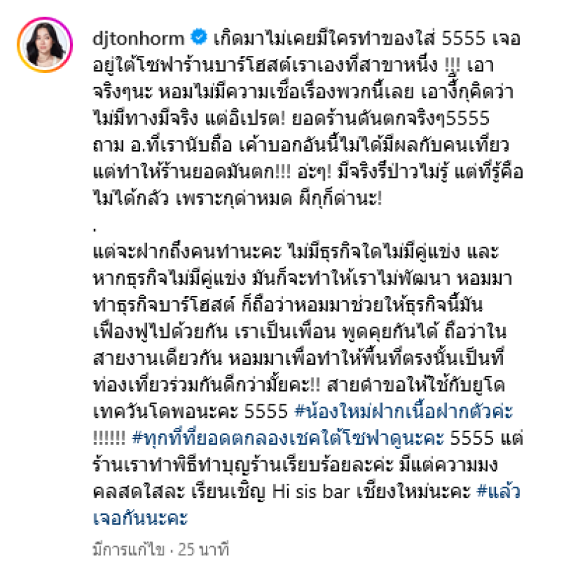 ล่าสุด ต้นหอม ได้โพสต์ข้อความในอินสตาแกรมหลังรู้ว่ามีคนเล่นสกปรกใส่ พร้อมเขียนข้อความว่า เกิดมาไม่เคยมีใครทำของใส่ 5555 เจออยู่ใต้โซฟาร้านบาร์โฮสต์เราเองที่สาขาหนึ่ง !!! เอาจริงๆนะ หอมไม่มีความเชื่อเรื่องพวกนี้เลย เอางี้กุคิดว่าไม่มีทางมีจริง แต่อิเปรต ยอดร้านดันตกจริงๆ5555 ถาม อ.ที่เรานับถือ เค้าบอกอันนี้ไม่ได้มีผลกับคนเที่ยวแต่ทำให้ร้านยอดมันตก อ่ะๆ มีจริงรึป่าวไม่รู้ แต่ที่รู้คือไม่ได้กลัว เพราะxูด่าหมด ผีxูก็ด่านะ