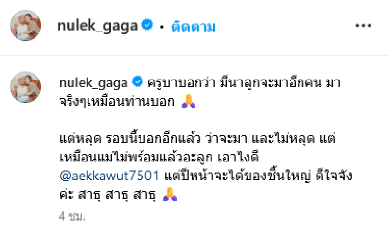 ล่าสุด หนูเล็ก ได้โพสต์เรื่องลูกคนที่2 ในอินสตาแกรมส่วนตัวว่า ครูบาบอกว่า มีนาลูกจะมาอีกคน มาจริงๆเหมือนท่านบอก แต่หลุด รอบนี้บอกอีกแล้ว ว่าจะมา และไม่หลุด แต่เหมือนแม่ไม่พร้อมแล้วอะลูก เอาไงดี aekkawut7501 แต่ปีหน้าจะได้ของชิ้นใหญ่ ดีใจจังค่ะ สาธุ สาธุ สาธุ งานนี้แฟนๆต่างพากันขอให้สมหวังกับเรื่องที่ครูบาได้ทักกันอย่างมาก