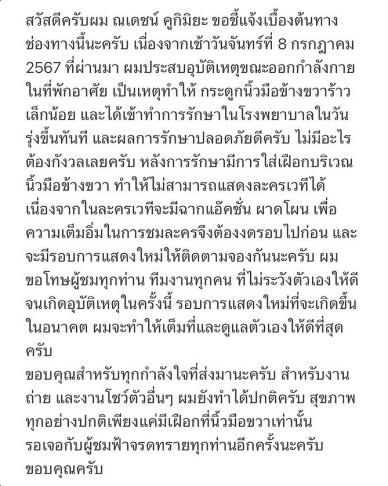 เรียกได้ว่าเป็นพระเอกชื่อดังมากความสามารถที่ส่วนตัวชอบออกกำลังกายทุกวันสำหรับ ณเดชน์ คูกิมิยะ ทำเอาแฟนๆแห่เป็นห่วงอย่างมากมายทีดียวสำหรับ ณเดชน์ ที่ล่าสุดได้โพสต์ข้อความว่าตนได้ประสบอุบัติเหตุในอินสตาแกรมส่วนตัวว่า สวัสดีครับผม ณเดชน์ คูกิมิยะ ขอชี้แจงเบื้องต้นทางช่องทางนี้นะครับ เนื่องจากเช้าวันจันทร์ที่ 8 กรกฎาคม 2567 ที่ผ่านมา ผมประสบอุบัติเหตุขณะออกกำลังกายในที่พักอาศัย