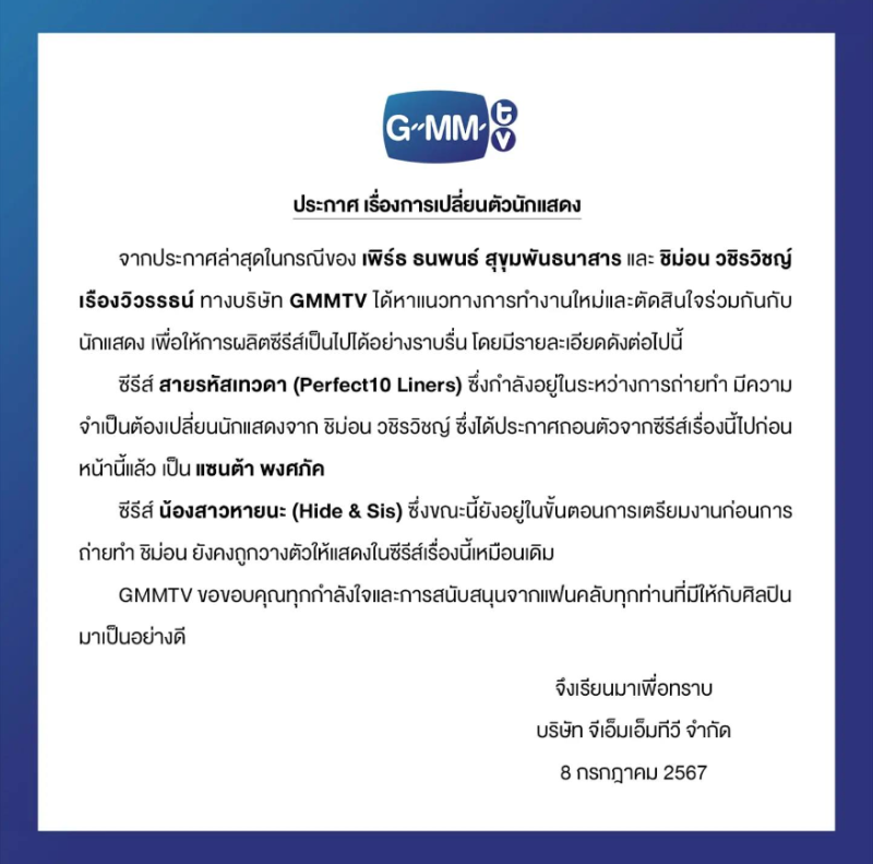 เรียกได้ว่า ทำเอาแฟนๆใจหายไม่ร้อย เมื่อล่าสุดทางค่าย GMM ได้ออกมาเผยการเปลี่ยนตัวนักแสดง เพราะทาง ชิม่อน วชิรวิชญ์ อยู่ในขั้นตอนการรักษาตัวและสภาพจิตใจนั่นเอง โดยได้เผยผ่านเพจ GMMTV ว่า ประกาศ เรื่องการเปลี่ยนตัวนักแสดง