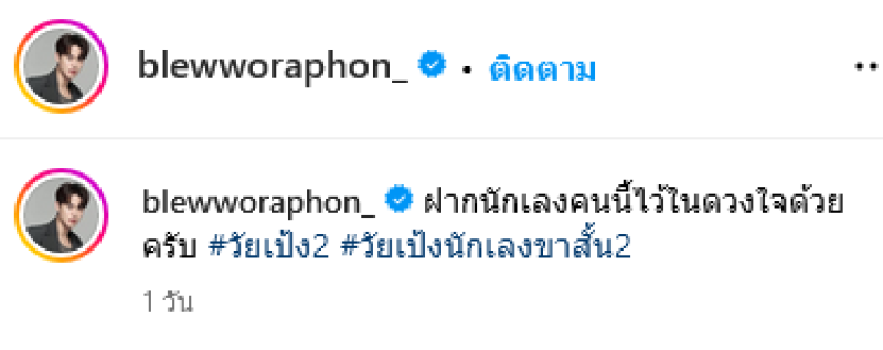 ล่าสุดทางด้าน บลิว ได้โพสต์ภาพเเละข้อความโปรโมทละครในอินสตาแกรมส่วนตัวว่า ฝากนักเลงคนนี้ไว้ในดวงใจด้วยครับ วัยเป้ง2 วัยเป้งนักเลงขาสั้น2 งานนี้แฟนๆตั้งตารอภาพยนต์เรื่องใหม่ของ บลิว และเข้ามาคอมเมนต์กันอย่างมาก อาทิ เอาเรื่องครับลูกพี่,หล่อออออจังงง,อยากทุบยี่สิบอั้กกกกกกก,หล่อมากกพี่บลิว ปลื้มพี่ตั้งแต่ละครเด็กเสเพล แล้ว ตอนนั้นหล่อมาก ปัจจุบันก็หล่อ เป็นต้น