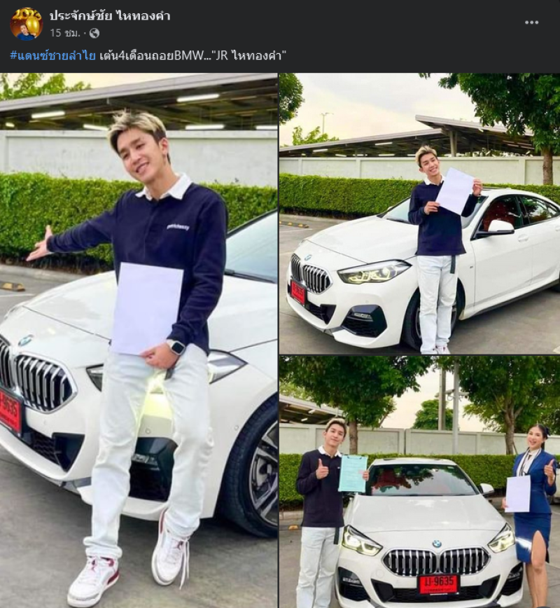 ซึ่งเฟซบุ๊คของนายห้าง ประจักษ์ชัย ไหทองคำ ได้โพสต์รูปเจอาร์และรถหรูป้ายแดงพร้อมแคปชั่นว่า แดนเซอร์ชายลำไย เต้น4เดือนถอย BMW...JRไหทองคำ
