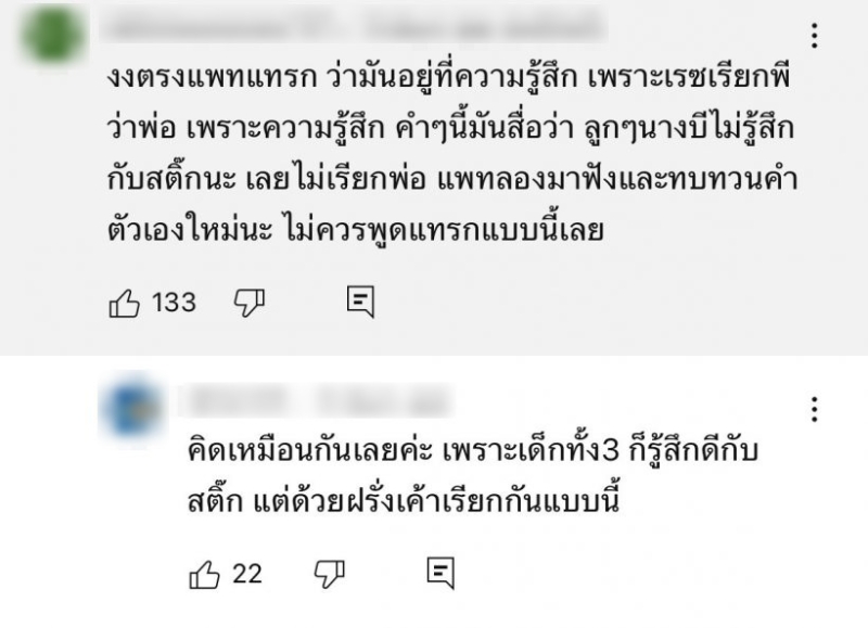 เเพท : เเพทว่าความรู้สึก เพราะอย่างลูกเเพทเรียกพ่อเเพทไม่ได้สอนเเต่เขารู้สึก เเต่เเพทก็เข้าใจว่านี่ก็โตเเล้วด้วย เเต่ตราบใดที่เขามาฟิลลิ่งเขาจะเรียก