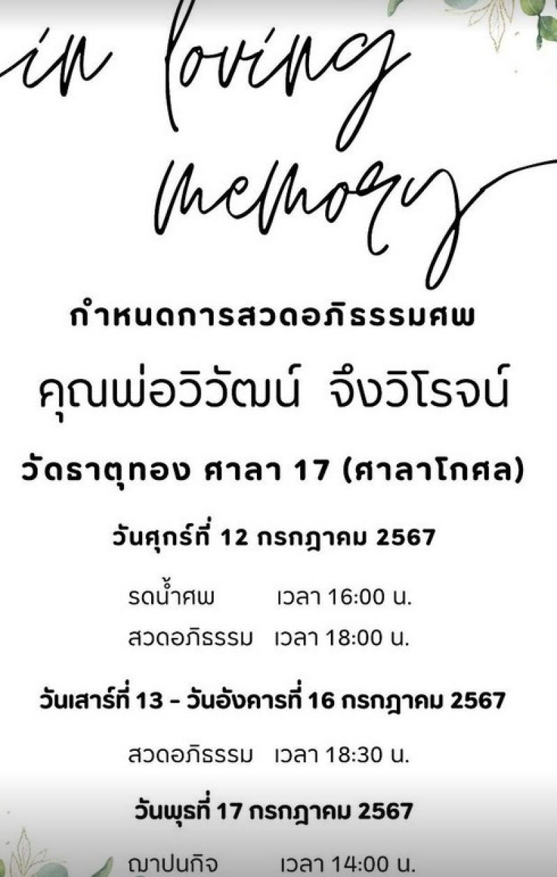 ทั้งนี้ กำหนดสวดพระอภิธรรมคุณพ่อวิวัฒน์ ณ วัดธาตุทอง ศาลา17 (ศาลาโกศล)