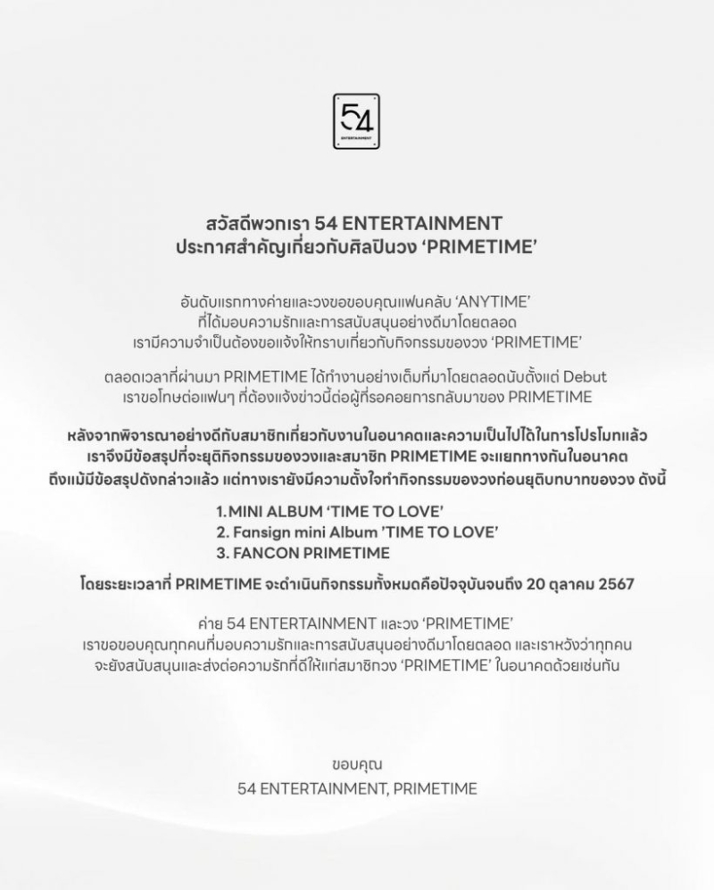 โดยทางต้นสังกัด ได้ออกมาโพสต์เเถลงการณ์ว่า สวัสดีพวกเรา 54 ENTERTAINMENT ประกาศสำคัญเกี่ยวกับศิลปินวง 'PRIMETIME'