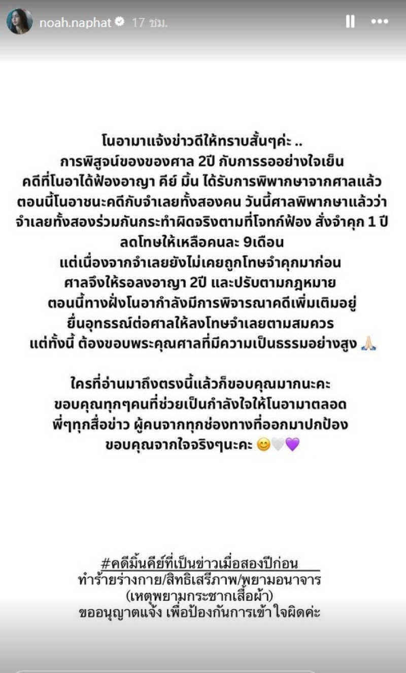 โดยเเจ้งว่า โนอามาแจ้งข่าวดีให้ทราบสั้นๆค่ะ การพิสูจน์ของของศาล 2ปี กับการรออย่างใจเย็น คดีที่โนอาได้ฟ้องอาญา คีย์ มิ้น ได้รับการพิพากษาจากศาลแล้ว ตอนนี้โนอาชนะคดีกับจำเลยทั้งสองคน วันนี้ศาลพิพากษาแล้วว่า จำเลยทั้งสองร่วมกันกระทำผิดจริงตามที่โจทก์ฟ้อง สั่งจำคุก 1 ปี ลดโทษให้เหลือคนละ 9เดือน แต่เนื่องจากจำเลยยังไม่เคยถูกโทษจำคุกมาก่อน ศาลจึงให้รอลงอาญา 2ปี และปรับตามกฎหมาย