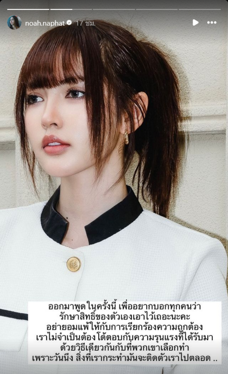 พร้อมทั้งยังเเจ้งอีกว่า ออกมาพูด ในครั้งนี้เพื่ออยากบอกทุกคนว่า รักษาสิทธิ์ของตัวเองเอาไว้เถอะนะคะ อย่ายอมแพ้ให้กับการเรียกร้องความถูกต้อง เราไม่จำเป็นต้องโต้ตอบกับความรุนแรงที่ได้รับมา ด้วยวิธีเดียวกันกับที่พวกเขาเลือกทำ เพราะวันนึง สิ่งที่เรากระทำมันจะติดตัวเราไปตลอด