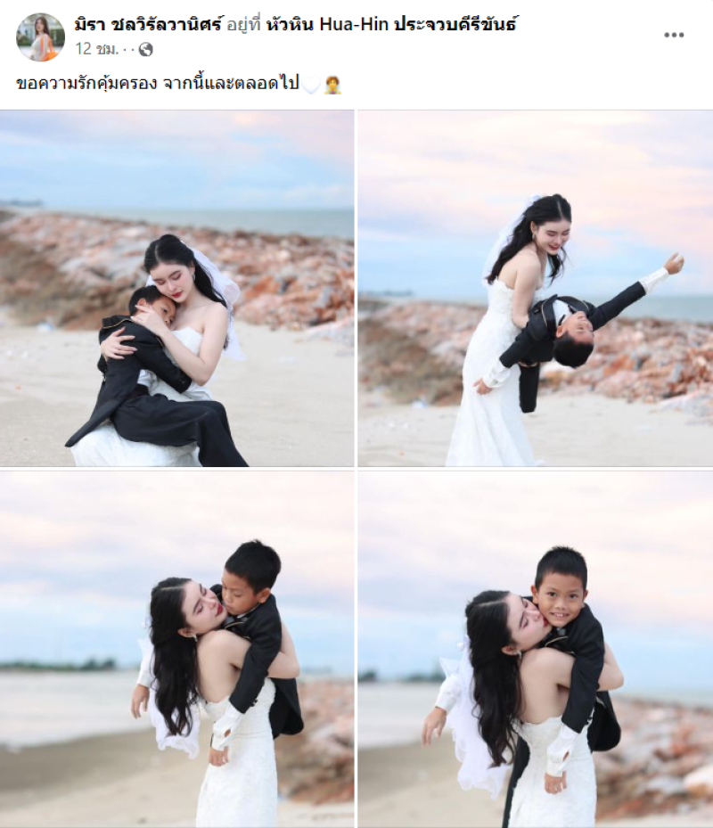 ล่าสุด เอ๋ได้โพสต์ภาพตนเองสวมชุดเจ้าสาว ถ่ายคู่กับลูกชาย อย่าง น้องสายแนน อยู่ริมทะเล คล้ายเป็นการถ่ายเบื้องหลังของภาพพรีเวดดิ้ง พร้อมเขียนแคปชั่น ขอความรักคุ้มครอง จากนี้และตลอดไป