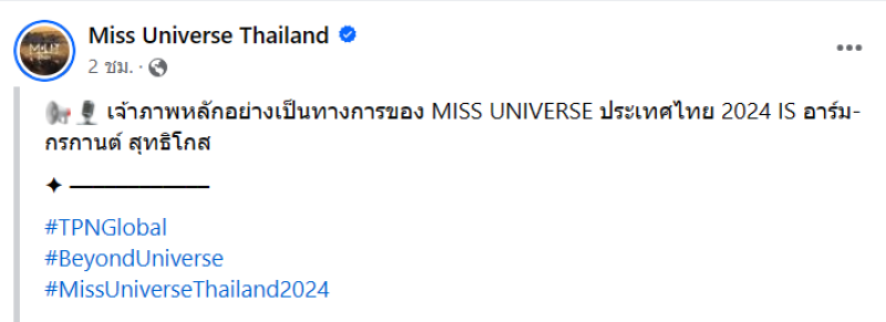 ล่าสุด ทาง เพจ Miss Universe Thailand ได้ออกมาเผยภาพพิธีกรสุดหล่อคนใหม่แล้ว พร้อมระบุข้อความว่า เจ้าภาพหลักอย่างเป็นทางการของ MISS UNIVERSE ประเทศไทย 2024 IS อาร์ม-กรกานต์ สุทธิโกส