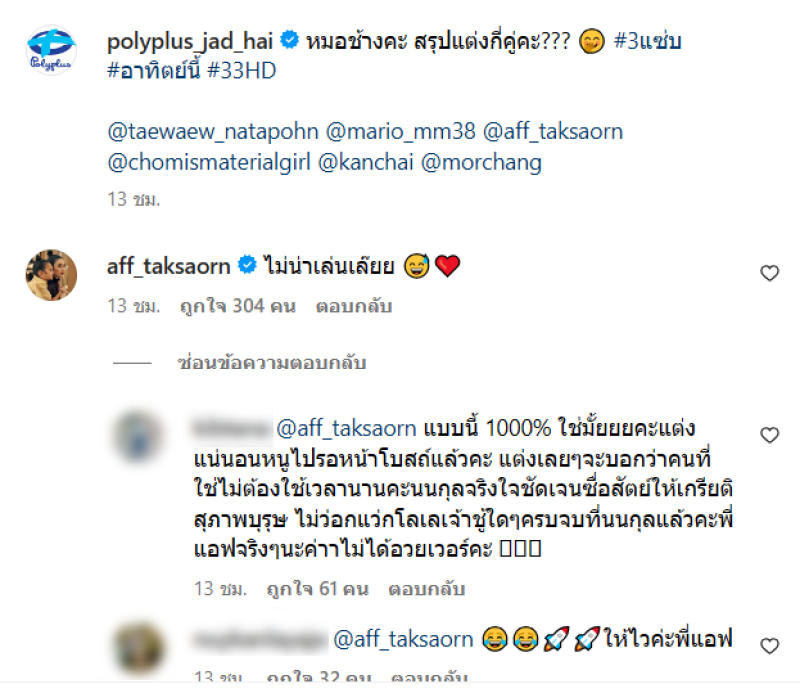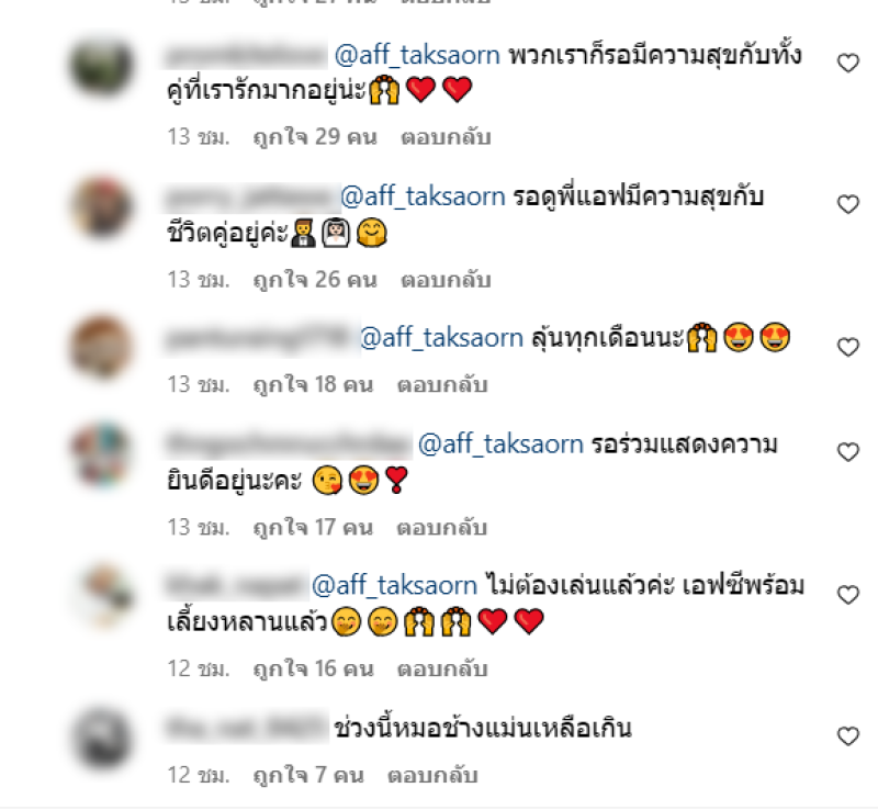 งานนี้ เหล่าแฟนๆต่างเชียร์ไปใหญ่ และบอกว่าตัดชุดรอเลย และแม่แอฟเองก็เข้ามาคอมเมนต์ใต้โพสต์ว่า ไม่น่าเล่นเล๊ยย