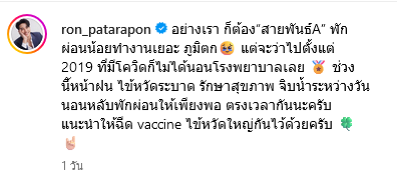 ช่วงนี้หน้าฝน ไข้หวัดระบาด รักษาสุขภาพ จิบน้ำระหว่างวัน นอนหลับพักผ่อนให้เพียงพอตรงเวลากันนะครับ แนะนำให้ฉีด vaccine ไข้หวัดใหญ่กันไว้ด้วยครับ งานนี้ทำเอาแฟนๆและเพื่อนในวงการบันเทิงแห่คอมเมนต์ส่งกำลังใจให้รัวๆ