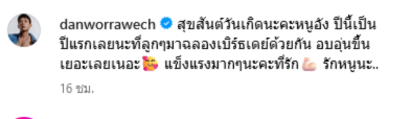โดยทางด้าน แดน ได้โพสต์ภาพคู่น่ารักๆลงอินสตราแกรมส่วนตัวพร้อมเขียนเเคปชั่นว่า สุขสันต์วันเกิดนะคะหนูอัง ปีนี้เป็นปีแรกเลยนะที่ลูกๆมาฉลองเบิร์ธเดย์ด้วยกัน อบอุ่นขึ้นเยอะเลยเนอะ แข็งแรงมากๆนะคะที่รัก รักหนูนะ ท่ามกลางคนบันเทิงและแฟนคลับต่างคอมเมนต์อวยพรวันเกิดให้ว่าที่คุณเเม่เป็นจำนวนมาก