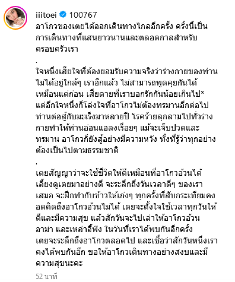 ใจหนึ่งเสียใจที่ต้องยอมรับความจริงว่าร่างกายของท่านไม่ได้อยู่ใกล้ๆ เราอีกแล้ว ไม่สามารถพูดคุยกันได้เหมือนแต่ก่อน เสียดายที่เราบอกรักกันน้อยเกินไป แต่อีกใจหนึ่งก็โล่งใจที่อาโกวไม่ต้องทรมานอีกต่อไป ท่านต่อสู้กับมะเร็งมาหลายปี โรคร้ายลุกลามไปทั่วร่างกายทำให้ท่านอ่อนแอลงเรื่อยๆ แม้จะเจ็บปวดและทรมาน อาโกวก็ยังสู้อย่างมีความหวัง ทั้งที่รู้ว่าทุกอย่างต้องเป็นไปตามธรรมชาติ