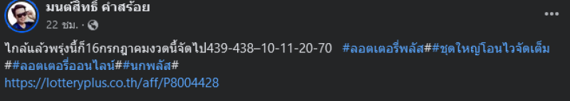ล่าสุด มนสิทธิ์ ก็ไม่พลาดที่จะเผยเลขเด็ดงวดนี้เช่นกัน ซึ่งได้โพสต์บนเฟศบุ๊คส่วนตัวว่า ใกล้เเล้วพรุ่งนี้ก็ 16 กรกฎาคม งวดนี้จัดไป 439-438-10-11-20-70