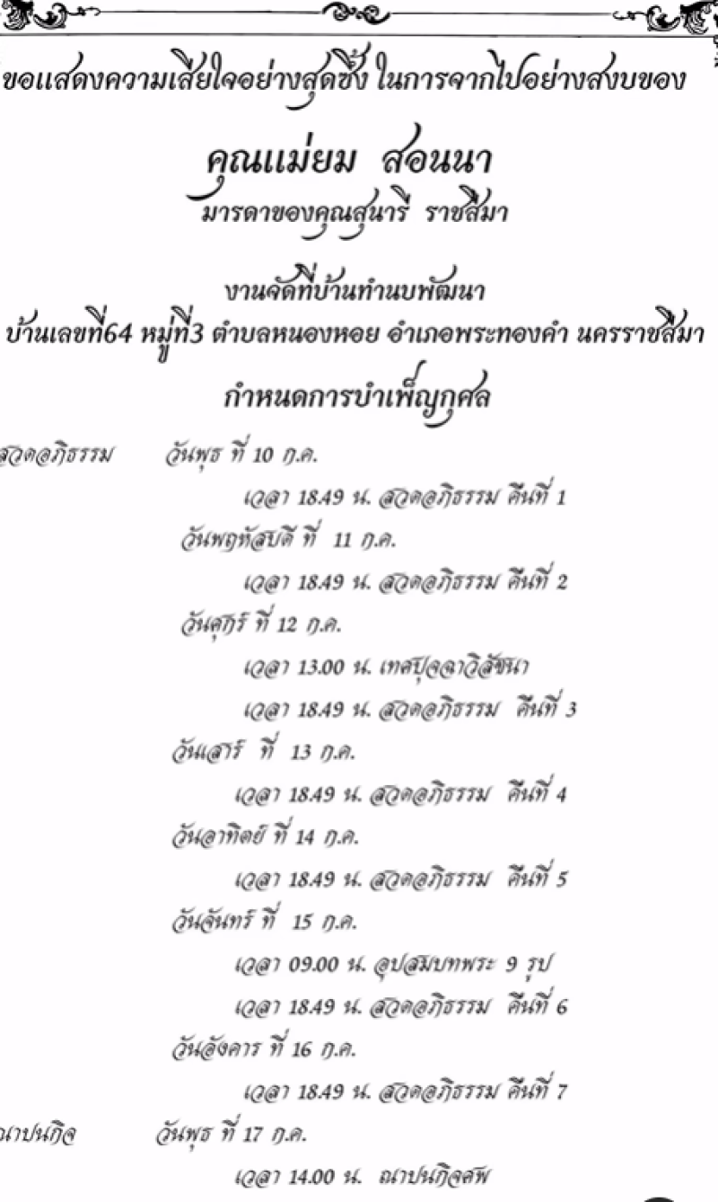 โดยวันนี้เป็นวันฌาปากิจ ซึ่งมีกำหนดการคือ วันที่ 17 ก.ค. 67 เวลา 14:00 น. ฌาปากิจศพ ณ วัดบ้านทำนบพัฒนา ต.หนองหอย อ.พระทองคำ จ.นครราชสีมา